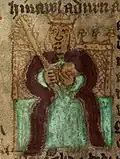 The History of the Kings, or Brut y Brenhinedd, is a Welsh translation of Geoffrey of Monmouth’s Historia Regum Britanniae (History of the Kings of Britain). The manuscript, which was copied in the late fifteenth century, is probably the only illustrated Welsh-language medieval narrative. It is part of the Peniarth Manuscripts collection at the National Library of Wales (Peniarth Ms. 23C).[1]