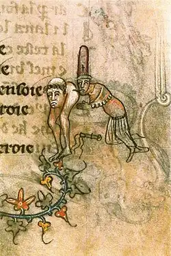 The manuscript illustration (c. 1350) alludes to the accusation of "obscene kisses" at the base of the spine