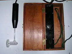 During this period, people were fascinated by the new technology of electricity, and many believed it had miraculous curative or "vitalizing" powers.[121][122][123] Medical ethics were also looser, and doctors could experiment on their patients. By the turn of the century, application of high voltage, "high frequency" currents to the body had become part of a Victorian era medical field, part legitimate experimental medicine and part quack medicine,[109] called electrotherapy.[123][69][124] Manufacturers produced medical apparatus to generate "Tesla currents", "D'Arsonval currents", and "Oudin currents" for physicians. In electrotherapy, a pointed electrode attached to the high voltage terminal of the coil was held near the patient, and the luminous brush discharges from it (called "effluves") were applied to parts of the body to treat a wide variety of medical conditions. In order to apply the electrode directly to the skin, or tissues inside the mouth, anus or vagina, a "vacuum electrode" was used, consisting of a metal electrode sealed inside a partially evacuated glass tube, which produced a dramatic violet glow. The glass wall of the tube and the skin surface formed a capacitor which limited the current to the patient, preventing discomfort. These vacuum electrodes were later manufactured with handheld Tesla coils to make "violet ray" wands, sold to the public as a quack home medical device.[125][126]