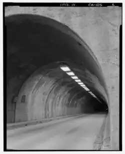 The administration of Yosemite National Park was transferred to the newly formed National Park Service in 1916, when W. B. Lewis was appointed as the park's superintendent. Parsons Memorial Lodge and Tioga Pass Road, along with campgrounds at Tenaya and Merced lakes, were completed the same year; six hundred automobiles entered the east side of the park using Tioga Road that summer.[77] The "All-Weather Highway" (now State Route 140) opened in 1926, ensuring year-long visitation and delivery of supplies under normal conditions.[78] Completion of the 0.8-mile (1.3 km)-long Wawona Tunnel in 1933 significantly reduced travel time to Yosemite Valley from Wawona.[79] The famous Tunnel View is on the valley side of the tunnel and Old Inspiration Point is above it. A flood, reduced lumber and mining extraction, and greatly increased automobile and bus use forced the Yosemite Valley Railway out of business in 1945.[80] The present day Tioga Road, now part of California State Route 120, was dedicated in 1961.[81]