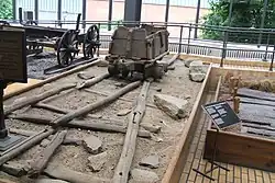 The earliest use of a railway track seems to have been in connection with mining in Germany in the 12th century.[2] Mine passageways were usually wet and muddy, and moving barrows of ore along them was extremely difficult. Improvements were made by laying timber planks so that wheeled containers could be dragged along by manpower. By the 16th century, the difficulty of keeping the wagon running straight had been solved by having a pin going into a gap between the planks.[3] Georg Agricola describes box-shaped carts, called "dogs", about half as large again as a wheelbarrow, fitted with a blunt vertical pin and wooden rollers running on iron axles.[4] An Elizabethan era example of this has been discovered at Silvergill in Cumbria, England,[5] and they were probably also in use in the nearby Mines Royal of Grasmere, Newlands and Caldbeck.[6] Where space permitted round-section wooden tracks to take trucks with flanged wheels were installed: a painting from 1544 by the Flemish artist Lucas Gassel shows a coppermine with rails of this type emerging from an adit.[7]