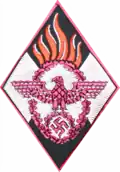 HJ-Feuerwehrscharen (Hitler Youth Firefighters) personnel were eligible to earn the HJ-Feuerwehrabzeichen (Hitler Youth Fire Brigade Badge), issued in two degrees; Formationsabzeichen (standard badge), edged in carmine, and the Führerabzeichen (fire unit leaders' badge), edged in white or silver. Apart from the edging, the badges were identical; a diamond-shaped cloth insignia worn on the lower-left outer sleeve of appropriate HJ uniforms, featuring a carmine Polizeiadler ("police eagle" insignia) superimposed on red and black flames. The badges were earned via a standardized pass-or-fail series of firefighting-related tests.