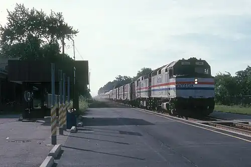![]() A westbound Amtrak train (either the Broadway Limited or Capitol Limited) passing through Hobart station in July 1990 | ||||||||||||||||||||||||||