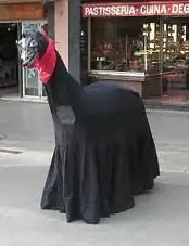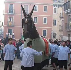 The Santa Tecla Festival takes place at Tarragona from 15 to 24 September and includes the saint's day, 23 September.[56] A number of animals, real and mythical, are impersonated in the parades that form a major part of the festivities. Among them is a larger-than-life Mulassa (mule) carried by two dancers who are hidden under its skirts, apart from their legs.