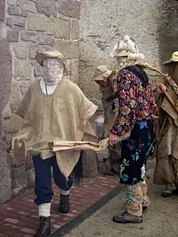 At Ezpeize the formal dancing is suddenly interrupted by a wild invasion. An unruly gang of rustically dressed characters, wearing masks or facial disguise, rushes into the dancing area in pairs, with loud cries. Some wave clubs. Some have furry tails. There is a doctor and a nurse, in white coats with a red cross on the back. They all race around the dancing space in an anti-clockwise direction and then fall to the ground in a writhing heap.[30]