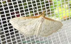 Adults are white, with two ragged brown arcs across each wing.[2] The larvae feed on Hibiscus, Gomphocarpus and Asclepias species (including Asclepias curassavica).[3]