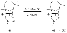 Derivatives of adamantane have also been prepared using the Hofmann–Löffler–Freytag reaction.[35] When N-chloroamine 56 was treated with sulfuric acid and heat, 2-adamantanone was formed, but photolysis of 56 in the sulfuric acid-acetic acid mixture, using a low-pressure mercury lamp at 25 °C for 1-hour gave a good yield (85%) of the desired product 57. The cyclization of 57 presented considerable difficulties, but it was finally achieved in 34% yield under forcing conditions (heating at 290 °C for 10 min).