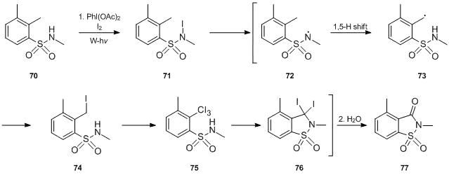The Suárez modification of the Hofmann–Löffler–Freytag reaction was the basis of the new synthetic method developed by H. Togo et al.[42][43] The authors demonstrated that various N-alkylsaccharins (N-alkyl-1,2-benzisothiazoline-3-one-1,1,-dioxides) 77 are easily prepared in moderate to good yields by the reaction of N-alkyl(o-methyl)arenesulfonamides 70 with PhI(OAc)2 in the presence of iodine under the irradiation of a tungsten lamp. 1,5 -Hydrogen abstraction/iodination of the o-methyl group is repeated three times and is most likely followed by cyclization to diiodo intermediate 76, which then undergoes hydrolysis.
