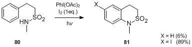 A very interesting transformation is observed when sulfonamides of primary amides bearing an aromatic ring at the γ-position are treated with various iodanes and iodine under the irradiation with a tungsten lamp.[44] The reaction leads to 1,2,3,4-tetrahydroquinoline derivatives and is a good preparative method of six-membered cyclic aromatic amines. For instance, sulfonamide 78 undergoes an intramolecular radical cyclization to afford 79 in relatively good yield.