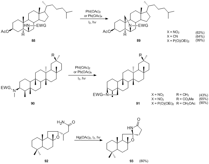 The utility of the Suárez modification of the Hofmann–Löffler–Freytag reaction was demonstrated by its application in synthesis of a number of steroid and triterpene compounds.[25][26][28][29][47] As illustrated below, the phosphoramidate-initiated funcionalizations generally proceed in higher yields than the reactions involving N-nitro or N-cyanamides.