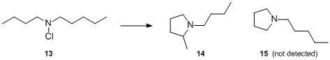 Investigation of the free radical decomposition of N-chlorobutylamylamine 13 allowed to determine 1° vs. 2° hydrogen migration. It was reported that only 1-n-butyl-2-methylpyrrolidine 14 was formed under the reaction conditions, no 1-n-amylpyrrolidine 15 was detected. This observation provided substantial evidence that the radical attack exhibits strong preference for the 2° over 1° hydrogen.