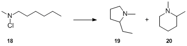 A qualitative study of products from the Hofmann–Löffler–Freytag reaction of N-chloromethyl-n-hexylamine 18 was performed in order to evaluate the relative ease of 1,5- and 1,6-hydrogen migration. UV-catalyzed decomposition of 18 followed by basification produced a 9:1 mixture of 1-methyl-2-ethylpyrrolidine 19 and 1,2-dimethylpiperidine 20, which demonstrates that the extent of formation of six-membered rings can be appreciable.