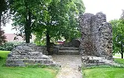 Stein Church Ruins (Stein kirkeruin) are located at Steinsfjorden. Originally constructed in the latter half of the 1100s, it was built of sandstone and limestone from the area. The chapel had a rectangular nave and narrower, very short choir area. The sanctuary had portals in the west and south. By the second half of the 1500s, the chapel was no longer in use. In the 1570s, the inventory had been transferred Hamar Cathedral.[9]