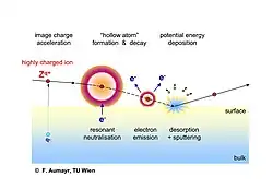 Hollow atoms (discovered in 1990 by a French team of researchers around Jean-Pierre Briand) are short-lived multiply excited neutral atoms which carry a large part of their Z electrons (Z ... projectile nuclear charge) in high-n levels while inner shells remain (transiently) empty. The hollow atoms are exotic atomic species whose all, or most, electrons lie in excited states, while the innermost shells are empty.[1] These atomic species were first observed during the interaction of highly charged ions with surfaces.[2] population inversion arises for typically 100 femtoseconds during the interaction of a slow highly charged ion (HCI) with a solid surface.