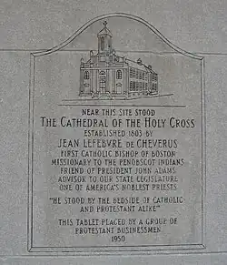 In 1950, an engraved tablet was placed adjacent to the St. Thomas More Oratory entrance at 49 Franklin Street. It reads: "Near this site stood THE CATHEDRAL OF THE HOLY CROSS, established 1803 by Jean Lefebvre de Cheverus, First Catholic Bishop of Boston; Missionary to the Penobscot Indians; Friend of President John Adams; Advisor to our State Legislature; One of America’s noblest priests. He stood by the bedside of Catholic and Protestant alike. This tablet placed by a group of Protestant Businessmen, 1950."[11]