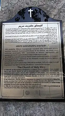During and after the Armenian genocide in the Ottoman Empire and the loss of their homelands about 50,000 Armenians found refuge in Iran. After the Sovietization of Armenia in 1920 and the purges under Joseph Stalin, more refugees from Armenia crossed the border to Iran, among them Nikolai Lauri from Nagorno-Karabakh, the architect of the church. So the number of Armenians – in their majority members of the Armenian Apostolic Church – in the Iranian capital increased significantly and the need to build a new church arose. On 17 April 1937, a meeting was held with the presence of Armenian architects, and Nikolai Lauri was asked to present a plan to build a church based on a budget of 60,000 tomans. However, Nikolai Lauri died in 1939, and the plan was realized by Nikolai Markov. Roman Isayan (called Isayev in Russia) financed the construction of the church, which cost 100,000 tomans. Construction works began on 17 April 1938 with the participation of a large number of Armenians and clergy of the churches in Tehran. The church was completed in 1938 and christened in 1945 by Karekin I, Catholicos of Cilicia, as the Church of Holy Mary.[1][2][3][4]
