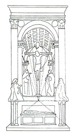 The Trinity is noteworthy for its inspiration taken from ancient Roman triumphal arches and the strict adherence to recently developed perspective techniques, with a vanishing point at the viewer's eye level,[5] so that, as Vasari describes it "a barrel vault drawn in perspective, and divided into squares with rosettes that diminish and are foreshortened so well that there seems to be a hole in the wall."[6] The effect of the correct perspectival projection may be called trompe-l'œil, which means "deceives the eye," in French. The fresco had a transforming effect on generations of Florentine painters and visiting artists. The sole figure without a fully realized three-dimensional occupation of space is God supporting the Cross, considered an immeasurable being. The kneeling patrons represent another important novelty, occupying the viewer's own space, "in front of" the picture plane, which is represented by the Ionic columns and the Corinthian pilasters from which the feigned vault appears to spring; they are depicted in the traditional prayerful pose of donor portraits, but on the same scale as the central figures, rather than the more usual 'diminution', and with noteworthy attention to realism and volume.