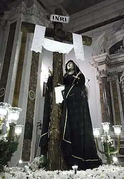 Bruno considered it essential to use sacred figures to educate the population, especially the most ignorant and illiterate:[20] an 1805 inventory compiled by the confraternity members reveals the presence of no less than two statues of Our Lady of Sorrows, a statue of St. Vincent Ferrer, a Dominican preacher, a wooden statue of St. Dominic, and two other important canvases, one concerning Our Lady of Graces by Fabrizio Santafede, the other Our Lady of the Rosary by Alonso de Corduba.[22] Following the suppression of the Society of Jesus, the confraternity disbanded in 1768 only to be refounded almost ten years later by some former brethren. In 1777 it obtained Royal Assent under the name of the Confraternity of the Purification, receiving, however, quite a bit of criticism from the townspeople but especially from the Archconfraternity of the Carmine, both because of arguments concerning precedence in processions and because the confraternity had been able to get Ferdinand IV to approve the reworked statutes of the previous Jesuit-style brotherhood, a religious order suppressed by the same king a few years earlier.[21] In the early nineteenth century the congregation moved to the new church of St. Dominic, built on the church of Our Lady of the Rosary, governed by the Scolopian fathers. In 1794, the confraternity commissioned a Neapolitan artist to make a statue depicting Our Lady of Sorrows: so central was the cult of the Virgin that on March 28, 1833, Pope Gregory XVI added the title “Our Lady of Sorrows” to the congregation's name.[23] In 1866 the order of the Scolopi was suppressed and the Ruvo city council, only a year later, ceded the church of St. Dominic to the now established confraternity of the Purification-Addolorata.[23] Thus arrived in Ruvo the new simulacrum, also known as Desolata, and in 1893, on Passion Friday, it crossed the threshold of St. Dominic's church for the first time. In 2020, the processional rite was not held, due to the COVID-19 emergency.