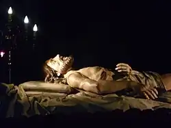 The small church of St. Roch began to be enriched with works of art commissioned by the brethren themselves, such as the 17th-century wooden statue of St. Roch, housed in the main niche above the altar; the oil painting, from the Neapolitan school, depicting Our Lady of Good Counsel, kept in a shrine displayed in the church; the silver statue of St. Roch by Giuseppe Sanmartino from 1793, kept in the cathedral, among other things displayed during the COVID-19 emergency in 2020, to invoke the saint's intercession and appease the pandemic. On March 16, 1919, the confraternity of St. Roch decided to provide itself with a simulacrum to be paraded during Holy Week:[10] the task was assigned to the Lecce papier-mâché master Raffaele Caretta, who was inspired by Antonio Ciseri's 1883 painting The Transport of Christ to the Sepulcher. The simulacrum fully and dramatically depicts the same characters as in Ciseri's work; leading the group and supporting the shroud in which Jesus' lifeless body is wrapped are Joseph of Arimathea and Nicodemus in front and St. John supporting the sheet behind Christ; completing the group are Mary of Clopas, who holds an almost fainting Mary, Salome and a penitent Mary of Magdala.[11] The statuary group made its debut on April 17, 1920, and first crossed the threshold of the church of San Rocco in the late afternoon; the same scene is still repeated today with Pancaldi's Eternal Sorrow funeral march that begins the procession, moved since 1921 to the usual night time of 2:30 a.m.[12] In 2020, the processional rite was not held, due to the COVID-19 emergency, despite the 100th anniversary of the simulacrum.