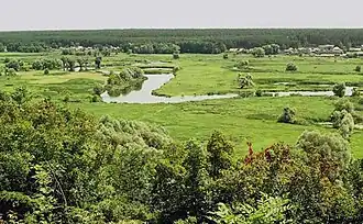 The terrain is one of hills and ravines, with maple-ash-oak forests on the slopes of the right bank, and pine forests on the sandy terraces of the left bank.[1] The forested areas are bordered by wet and dry meadows, with numerous small lakes.[1] 500 hectares of the forest are 130–150 years old, with some oaks 200–300 years old.