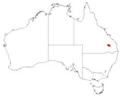 Found in a small area north of Chinchilla Queensland. Grows on deep sandy soils in heath and shrubby woodland on flat terrain.[5]