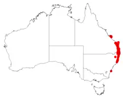 Twiggy homoranthus grows in semi-shaded or open situations from Byfield and south to Laurieton within 20 km of the coastline. Also on several islands close to the mainland of eastern Australia, e.g. Fraser, Bribie, Morton and Stradbroke Islands.[4]