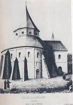 In 1599 the remains of the abbey premises were sold by the Archdukes of Austria to Andlau Abbey.[6] The transfer was confirmed by Pope Paul V in 1616. In 1782 the abbess of Andlau ordered the demolition of Honcourt, as its upkeep had become too expensive, and nothing now remains. The consequent architectural loss to the region was great, as the buildings were of high interest. Honcourt was a strategic point in the line of entry of Romanesque and Burgundian art into Alsace, between the churches of Saint-Dié and St. Faith of Sélestat.