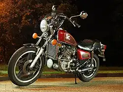 The CX650 Custom was a one-year model produced in 1983 for the US market. Like other CX customs, especially the CX400C designed for Asia-Pacific, this model was a cruiser. The frame is completely different, and the styling was marketed to accommodate the American desire for the low stretched look of American cruiser bikes. Its semi chopped fork, tear drop tank, low seat and truncated exhaust gave it a very rakish look. However, it was very similar in styling and price range to the 750 Shadow and Honda elected to have only one cruiser bike in that class, thus the reason for its short model life.
