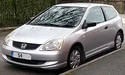 The seventh-generation Honda Civic is an automobile produced by Honda from 2000 until 2005. It debuted in September 2000 as a 2001 model. Its exterior dimensions stayed similar to the outgoing predecessor, with interior space significantly increased, bumping it up to the compact car size designation. A notable feature was the flat rear floor that gave better comfort to the rear seat passengers. This generation abandoned the front double wishbone suspension, used previously from fourth to sixth generations, replacing it with MacPherson struts. This generation was the last to offer 4WD variants.