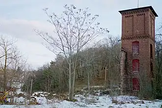 The Hop-o'-Nose Knitting Mill was a structure representative of the industrial history of Catskill, New York in the nineteenth century. The mill was built by Wolfe Bros., carpenters, and Mull & Fromer, Masons and Builders, in 1881[2] at 130 West Main Street. West Main Street is located on the western side of Catskill Creek, while East Main Street is on the eastern side of the creek. The mill was named to the National Register of Historic Places in 1995 as Hop-O-Nose Knitting Mill. It has since been demolished, with the exception of the tower, which remains overlooking a lot full of brick demolition debris.[3]