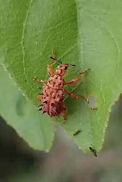 Hoplapoderini is a tribe of weevils of the subfamily Apoderinae. They are characterized by a strongly constricted head with a distinctively arched crown.[2] The head shape is common to both males and females. They are distributed from Japan to the Indomalayan archipelago, as well as throughout Madagascar and Africa. Their lower body tends to be characterized by spots, pustules, bumps, or spines. Spines are particularly ubiquitous in those species found in Madagascar.