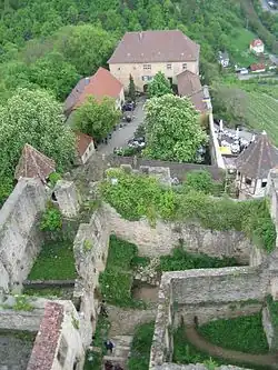 Hornberg Castle (German: Burg Hornberg) is a partially ruined castle located on a steep outcrop above the Neckar valley above the village Neckarzimmern, between Bad Wimpfen and Mosbach. It is the largest and oldest of the castles in the valley.[1]