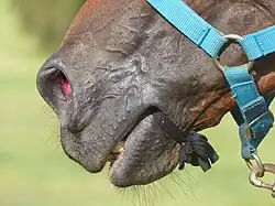 Chewing in horses is a combination of licking and mastication, during which the mouth is open and the tongue is visible, leading to saliva secretion.[21] This behavior can serve multiple purposes and convey various meanings, including submission, relaxation, well-being, or discomfort. In their natural state, horses often chew while waiting for their turn to drink,[21] when standing and expressing relaxation after a rest, or as a way to soothe themselves and display submission to another horse.[23] When relaxed, a horse may engage in light chewing movements.[24]