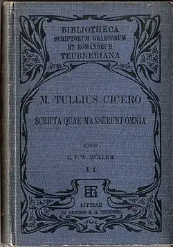 The first standard critical edition of the Hortensius fragments were included the Teubner edition of Cicero (Pt. IV, Vol. III), edited by C. F. W. Mueller and released in 1890. In 1892, Otto Plasberg wrote a dissertation on the fragments in which he hypothesized as to the order to the fragments. In 1958, Michel Ruch authored a fifty-three-page thesis on the Hortensius that explored its influences, composition date, structure, subsequent impact, and disappearance. Ruch's work also reorganizes the fragments and provides each one with a French translation and commentary.[11][49] In 1962, Alberto Grilli produced Hortensius, the current standard edition for citation.[40][50]