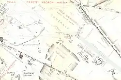 In 1904 a large mosaic floor with hunting scenes belonging to a long portico of the horti and dated to the early 4th century was found during the construction of the railway underpass. It was in excellent condition, but only 3/5 was removed because the rest remained under the railway tracks. It remained in a warehouse for decades and was "rediscovered" recently and since 1997 it has been exhibited in the Centrale Montemartini museum.[10]