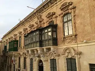 The Hostel de Verdelin is an early example of Baroque architecture in Malta.[21] Its ornate façade has significant influences from the Spanish Baroque style, which is unusual in Malta, where Italian and French Baroque are more common.[8] Its façade is said to be one of the finest in Valletta[22] and described as being an impressive example of artistic fabric in urban Malta.[23] The ornate windows are the centerpiece of the façade.[24] In the 19th century, during the British period, closed timber balconies replaced earlier structure[4] that originally consisted of stone balconies.[25] An artistic interpretation of de Verdelin in form of a painting is found within the building.[26] The palace is the largest of three adjacent buildings which belonged to Verdelin.[7]