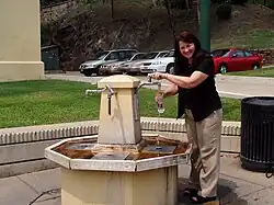 Drinking water is dispensed from several hot water jug fountains. The hot water is naturally potable. Two cold water springs (Happy Hollow and Whittington Springs) are treated using ozone filtration. Regulations prohibit private individuals from selling the park's waters.[27]
