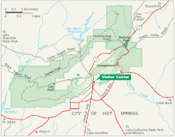 The park operates a public campground at Gulpha Gorge, about 2 mi (3.2 km) from downtown Hot Springs.