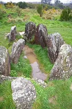 The dead were probably deposited there on the south side, passing through a lower slab.[8] The funerary furniture found consisted of polished dolerite axes, flints, jewellery pendants, coarse late Neolithic ceramics, millstones, hammerstones, and grinding wheels.[1][12][8] The whole construction has been dated between 3500 and 2500 BC.[11] Carbon-14 dating of charcoal found on site refined the estimate to between 3355 and 2890 BC.[1]