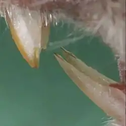 Newborn males and females can be distinguished on close examination as the anogenital distance in males is about double that of the female.[10] From the age of about 10 days, females have five pairs of mammary glands and nipples; males have no nipples.[11] When sexually mature, the most striking and obvious difference is the presence of testicles on the males. These are large compared to the rest of the body and can be retracted into the body.[12]