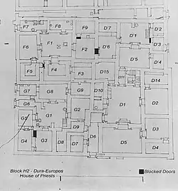 The House of Priests was excavated between 1929 and 1930 under French archeologist and Egyptologist Maurice Pillet, who was then Field Director of the excavation at Dura-Europos on the Syrian Euphrates, during the third expedition to the site.[2] Pillet's two assistants, André Naudy and Henry T. Rowell, took over the direction of the campaign after he fell ill and left the site in January 1930.[3] The excavations of block H2 were disturbed by heavy rains in January and February 1930, especially since the temples and the house were on a low level which left them susceptible to flooding. To remedy this, the team built an embankment southwest of the block to prevent flooding and subsequently rebuilt it three times.[4]