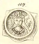 In the first half of the 12th century, only family members with the name Dietrich appear. As there are no further characterisations, it is difficult to provide a more precise name or genealogy.[4] A family tree attempted by Otto Konrad Roller distinguishes Dietrich I (named until 1123) from Dietrich II (named between 1135 and 1147).[5] From 1147 onwards, the family remained completely silent for almost three decades, with a Dietrich von Rötteln not appearing again until 1175. One possible explanation is that the Dietrich (II) mentioned before 1147 died quite young, possibly on the Second Crusade. His widow probably married a lord of Tegerfelden.[6] This also explains why Dietrich III, mentioned from 1175 onwards, referred to the cleric Konrad von Tegerfelden as his brother. Conversely, Konrad later also donated a death anniversary memorialization for the salvation of his "brother" Dietrich von Rötteln, among others.[7] The connection with Tegerfelden also seems to have influenced the naming of the Röttler family, as Dietrich III's children include the names of his presumed half-brother and stepfather, Konrad and Lüthold. Dietrich III no longer appears in the documents after 1187.[8] In 1204, his half-brother Konrad von Tegerfelden donated a bereavement ceremony for him and other relatives.[9]