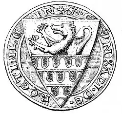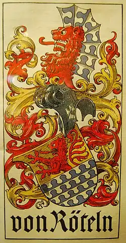 "The Castle Rotwasserstelz in Klettgau (municipality of Hohentengen, Waldshut district), which was also called Rötteln, was the name of a ministerial or knightly family...".[53] The known members of this family were, among others, ministerials and feudatories of the Lords of Krenkingen, Lords of Klingen and Lords of Regensberg. A nobleman, Hans von Rötteln, appears in 1362 as a feudatory of Johann II of Habsburg-Laufenburg. From a partially preserved seal of Hermann von Rötteln and a reference in the literature,[54] it was concluded that these Röttelns bore a coat of arms similar to that of the noblemen of Rötteln.[55] However, there is no evidence of a connection between the two families.