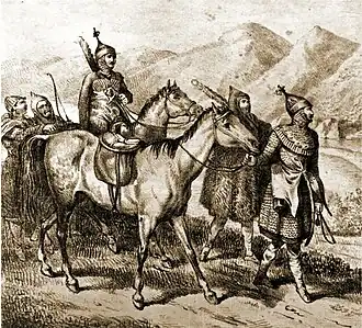 According to Lhuillier, the Shupago family migrated from the Crimean Peninsula with the Kabardians in the Late Middle Ages and settled among the Natukhaj on the Black Sea coast.[1][9] The family gained a large sphere of influence when they allied with the Natho's, a powerful dynasty of the Natukhaj.[12] The Shupago's had kinship ties with the Kudenet dynasty in Kabardia and the Berzeg dynasty in Ubykhia.[3][13][14] Sultan Khan-Giray, a Circassian ethnographer, described the House of Shupago as "the leading house of the Natukhaj's".[1] Mehmed Indariqo Shupago, the owner of Pshad and the head of the Shupago's, belonged to a sub-branch called Kiriakin, which was identified by a tamga resembling the cursive letter 'т' in the Russian alphabet.[4][5]