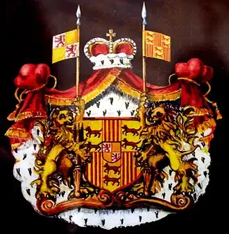 The following division of the House De Silva Fernández de Híjar Portugal into three lineages (two Spanish and one Italian),[c] was due to three children born from the two marriages of Don Andres Avelino de Silva Fernández de Híjar Portugal y Fernández de Cordoba (1806-1885)[7] XIV Count-Duke of Aliaga and Count of Palma del Rio. From the first wedding with Doña Josefina de Ferrari y Bonet (1819-1876)[8] (daughter of Don Jeronimo de Ferrari of Parma, “Kapellmeister” of King Ferdinando VII of Borbone) was born Doña Josefa Maria del Carmen de Silva Fernández de Híjar Portugal (1837-1906);[9] who, with her daughter -doña María Dolores (1861-1923)- and with Doña María Dolores's son Don Vittorio Umberto de Silva Fernández de Híjar Portugal (1881/1954) [illegitimate son whom Doña Maria Dolores de Silva Fernández de Híjar Portugal had with Don Carlos Maria Fitz James Stuart y Portocarrero Palafox (1849-1901)XVI duke of Alba] by matrilineal descent gave origin to the Italian lineage still in existence.[10] From his second wedding with Doña Mary Caroline Elisabeth Campbell y Vincent (1820-1894)[11] were born ten children of whom two, [Alfonso I (1848-1930)[12] and Jaime (1852-1925)[13]], gave origin to the two Spanish lineages still in existence, too. The Spanish lineage of Alfonso I, like it had already happened to the House De Silva Fernández de Ixar Portugal with two unions between the De Silva and the Fitz James Stuart,[6] rejoined the descendants of James Fitz-James I Duke of Berwick (1670-1734) [illegitimate son, who James II Stuart (1633-1701) King of England had with Arabella Churchill y Drake (1648-1730) sister of John Churchill I Duke of Marlborough] when Doña Maria del Rosario de Silva Fernández de Híjar Portugal y Guterbey(1900-1934) married Don Jacob Fitz James Stuart (1878-1953) IX Duke of Berwick and XVII Duke of Alba. In this way, by matrilineal descent, the Spanish lineage of the De Silva joined the dukedom of Híjar and its titles with the House Fitz James Stuart y de Silva Fernández de Híjar Portugal. Whereas the descendants of Don Jaime have just the titles of Dukes of Lecera and Dukes of Bournonville, the Fitz James Stuart y de Silva hold, actually, the majority of the titles of the House De Silva.