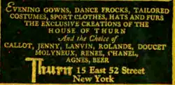 House of Thurn was an haute couture label founded by Sidonie Thurn and continued by her daughter Carolyn Hague. The house, known by its label as Thurn, prepared made-to-order fashions for its wealthy customers. Begun as a small import shop in Brooklyn, Thurn occupied a succession of buildings on or near Fifth Avenue from 1870 to 1934. The last of these was a remodeled Gilded Age townhouse located between Madison and Fifth Avenues at 15 East 52nd Street. An article in Arts & Decoration magazine for July 1923 described this location as "a charming salon, all flattering French gray, with sparkling mirrors and gracious French furniture covered with satin damask of gray and gold."[1] In 1926, a writer for The Nation listed Thurn as one of the sixteen most exclusive houses in New York.[2] In 1937, the owner of one of the sixteen houses, said that Thurn had been "practically the highest class business establishment of the kind in New York City."[3]: 89 Museum collections that hold Thurn fashions include the Metropolitan Museum of Art, The Los Angeles County Museum of Art, the Hillwood Museum, the Indianapolis Museum of Art, and the Fashion Institute of Design Museum, Los Angeles.