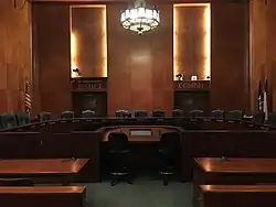 The design on the lobby floor depicts the protective role of government. In the grillwork above the main entrances are medallions of "great lawgivers" from ancient times to the founding of America, including Thomas Jefferson, Charlemagne, Julius Caesar and Moses,[3] and an outdated city seal adorns the interior doorknobs.[2]
