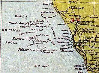 - ^ "Great Circle Distance between GERALDTON and HOUTMAN ABROLHOS". As the Cocky Flies. Geoscience Australia, Australian Government. Archived from the original on 24 September 2015. Retrieved 15 November 2007.