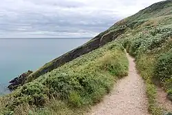 Howth is also a destination for cyclists, joggers and hill-walkers alike, particularly on weekends. One attraction is the six-kilometre long Cliff Path Loop.[42] The loop walk takes about two hours to complete, is rated with an easy to moderate difficulty, and begins and ends at the Howth DART [Railway] Station. Another common walk is the original Cliff Walk to Red Rock in Sutton.