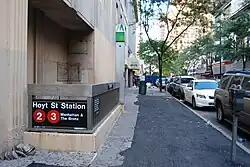 The Hoyt Street station (signed as Hoyt Street–Bridge Street and Hoyt Street–Fulton Mall) is a local station on the IRT Eastern Parkway Line of the New York City Subway in Downtown Brooklyn. Located under the intersection of Fulton Street, Hoyt Street, and Bridge Street, the station is served by the 2 train at all times and the 3 train at all times except late nights.